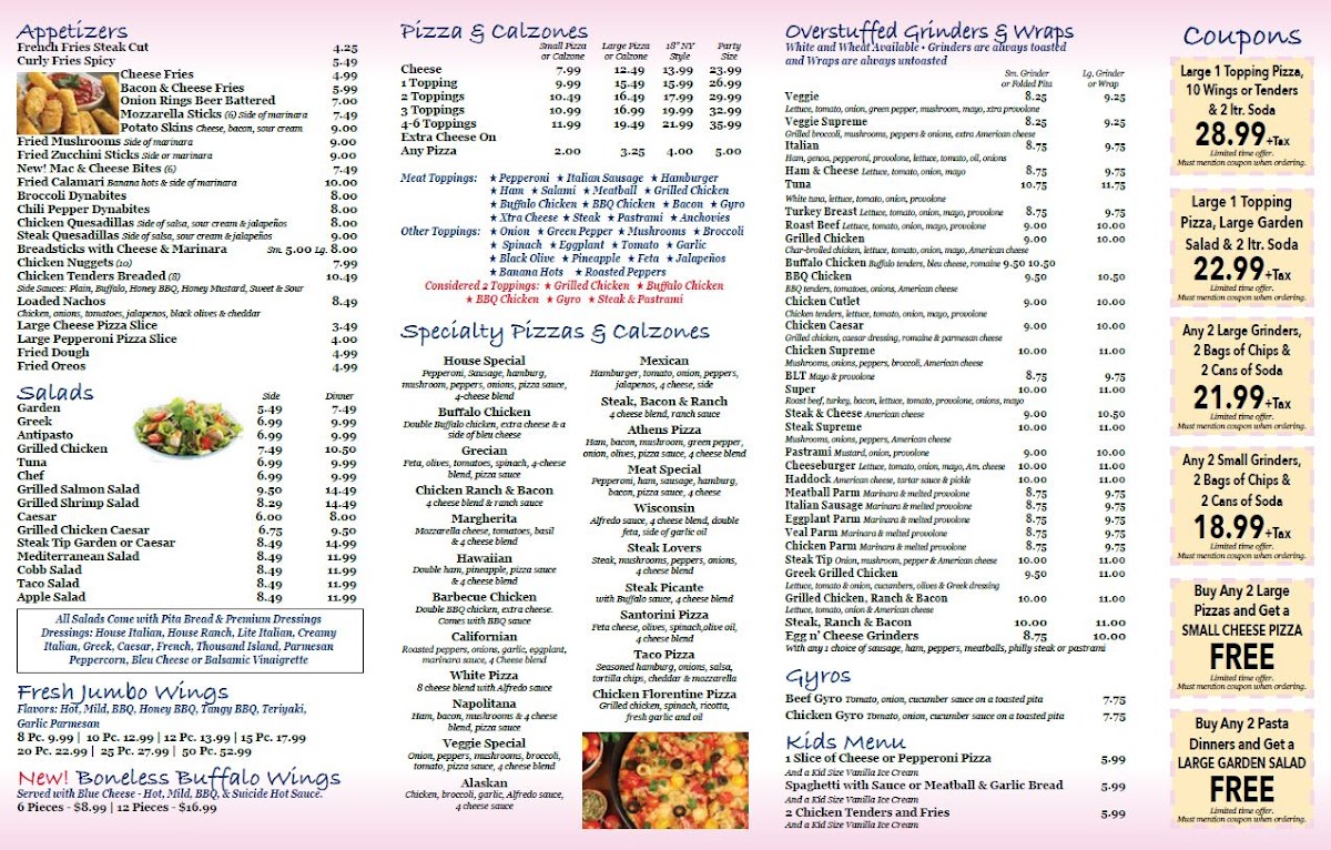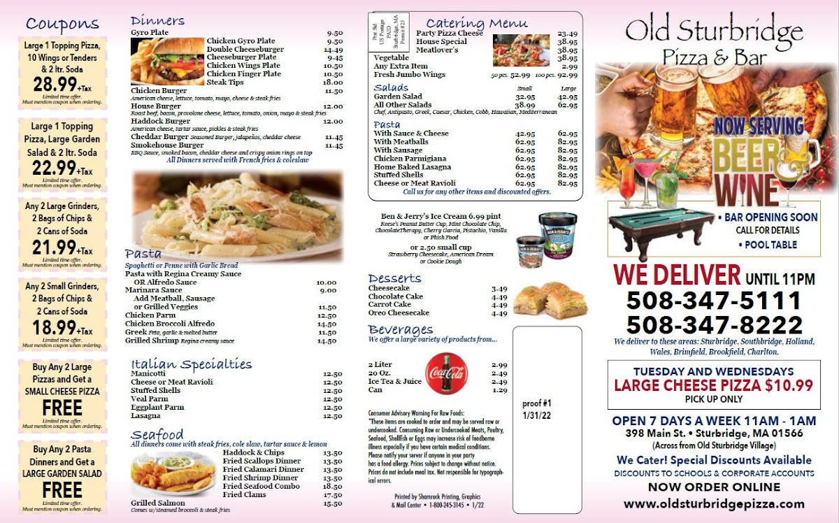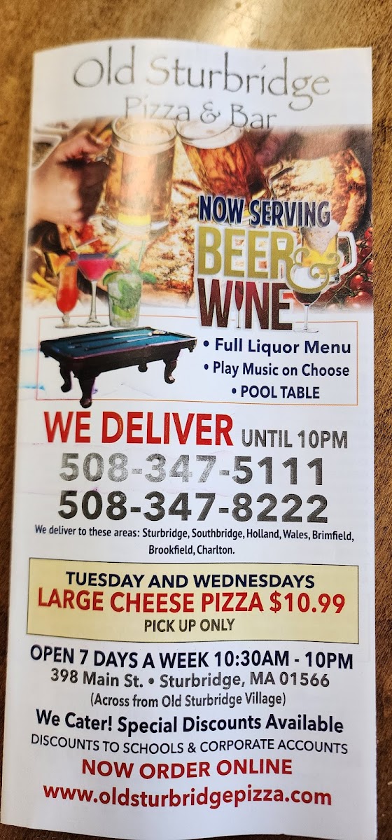 The menu at Old Sturbridge Pizza & Restaurant feels thoughtfully built around crowd-pleasing comfort food, with a clear focus on value, variety, and consistency. The standout combo, Large 1 Topping Pizza 10 Wings or Tenders & 2 ltr Soda, perfectly captures the restaurant’s approach-generous portions designed for sharing, ideal for families or groups who want everything on the table without overthinking the order. Classic pies like Pepperoni Pizza deliver exactly what you expect: a familiar, satisfying balance of cheese and savory toppings, while the Large Mushroom & Sausage Pizza adds a heartier, more robust option for those craving deeper flavors. The menu doesn’t rely on pizza alone; the Chef Salad provides a fresh, well-rounded alternative that complements the heavier items and adds flexibility for different appetites. To round things out, Breadsticks with Cheese & Marinara serve as an easy, indulgent side that pairs naturally with any order. Taken together, the menu feels cohesive and practical, emphasizing dependable favorites, shareable combos, and straightforward choices that make ordering simple and enjoyable.